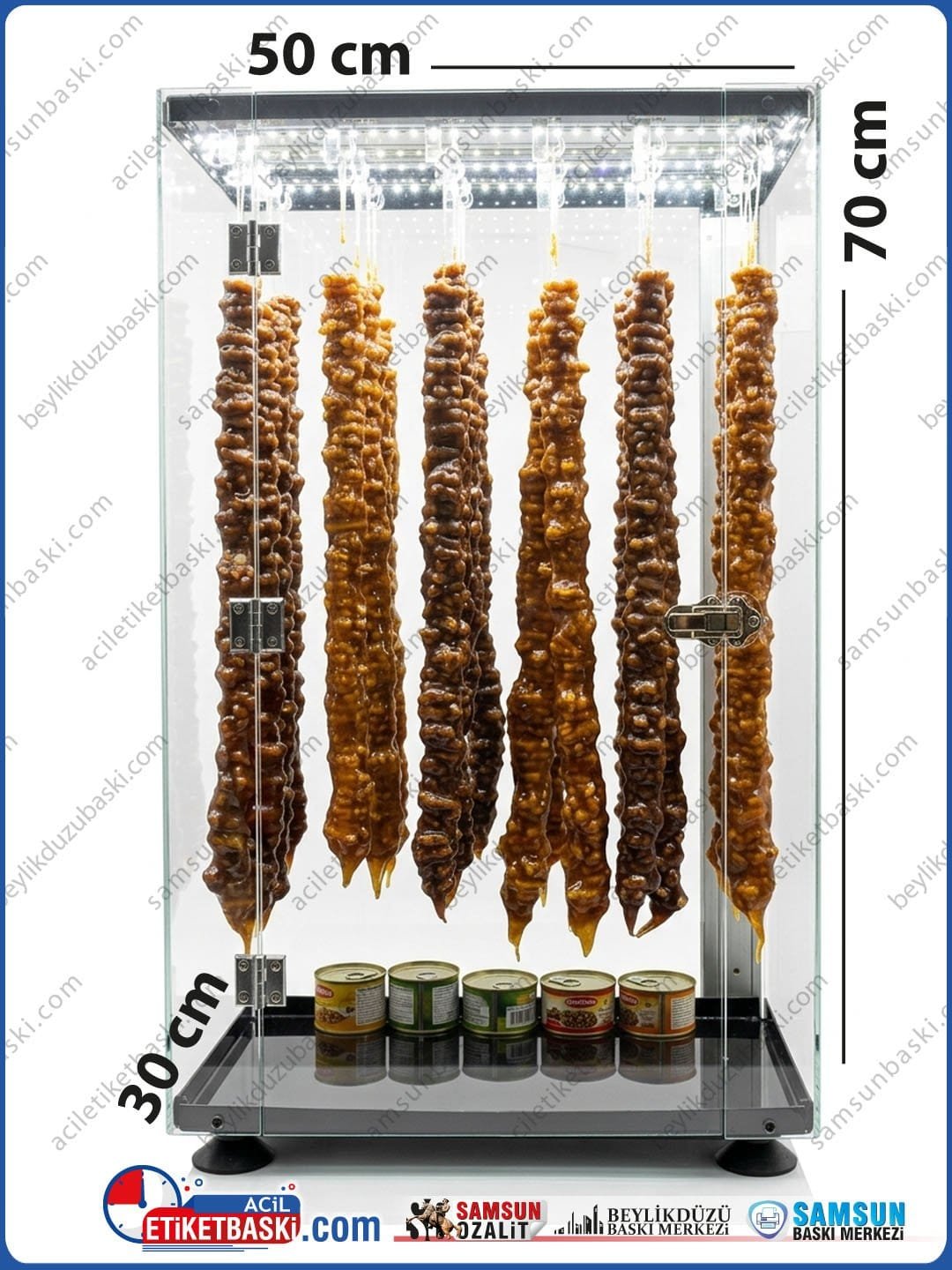 Illuminated plexiglass churchkhela display box products are produced on the same day in our Samsun printing center with high resolution quality on professional materials, suitable for personal or corporate needs, and offered with the advantage of fast shipping.