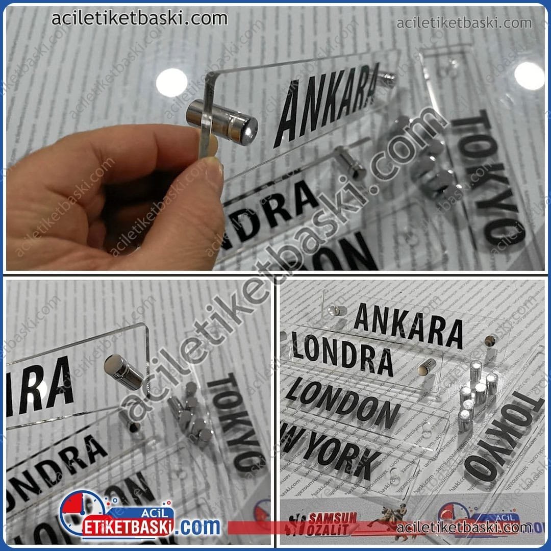 Dünya saatlerinin altına şehir isimlerini profesyonel şekilde yerleştirmek için üretilen pleksi tabela, 5 mm şeffaf malzemesi ve dekoratif vida detaylarıyla hem dayanıklı hem de estetik bir görünüm sağlar. Üzeri folyo kesim harf uygulaması ile hazırlanır ve uzun süre güneş, nem ve iç-dış ortam koşullarına dayanıklıdır. Kurumsal alanlar, oteller, danışma ve resepsiyon bölümleri için şık bir tamamlayıcıdır. İhtiyaca göre özel ölçü, yazı fontu ve şehir adı tasarlanabilir. Hızlı üretim imkânı ile acil tabela ihtiyaçlarında da pratik çözüm sunar.