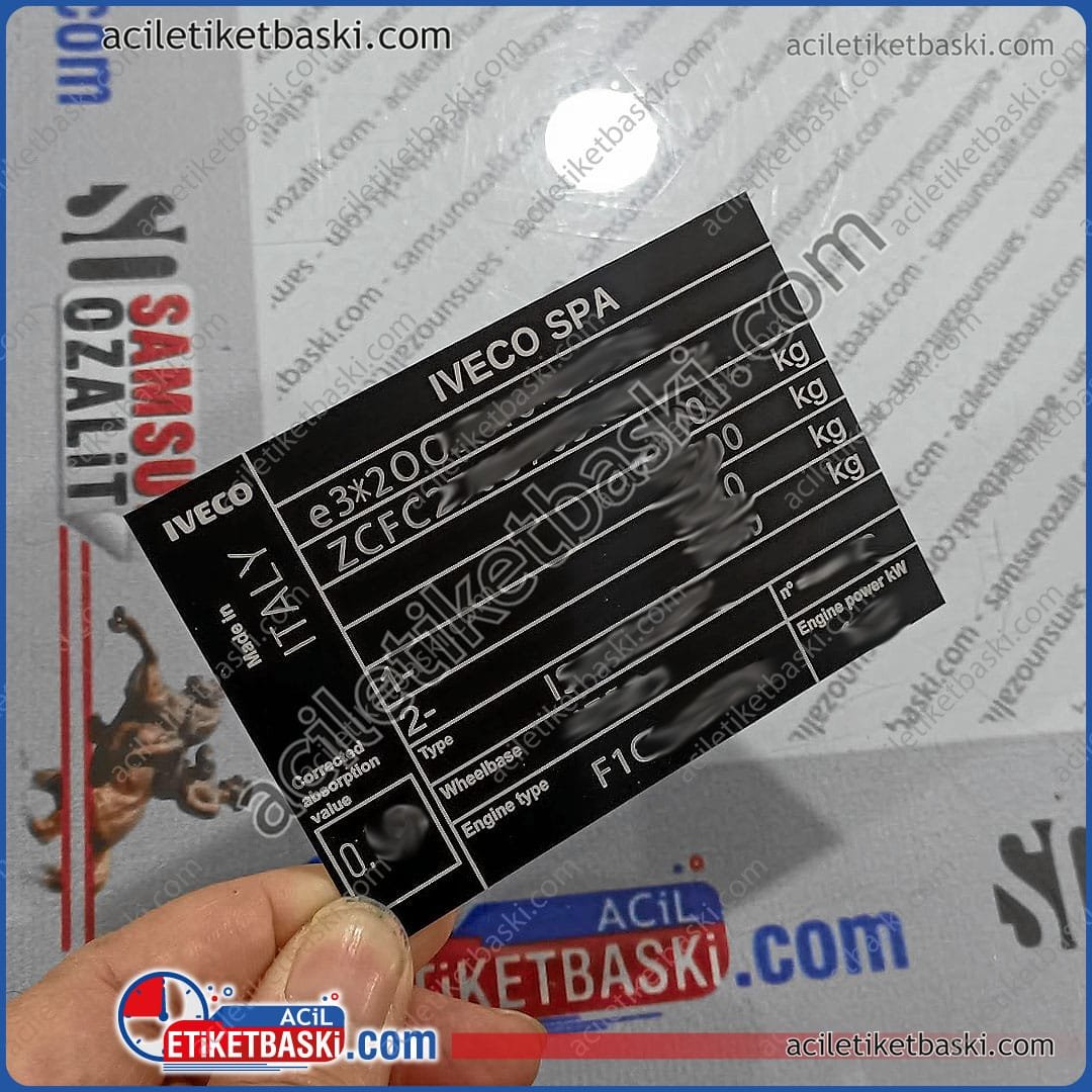 Iveco kamyon ve taşıyıcı araçlar için aslına uygun paslanmaz alüminyum motor numarası ve bilgi etiketi üretimi. Muayeneye uygun, dayanıklı ve net baskı.