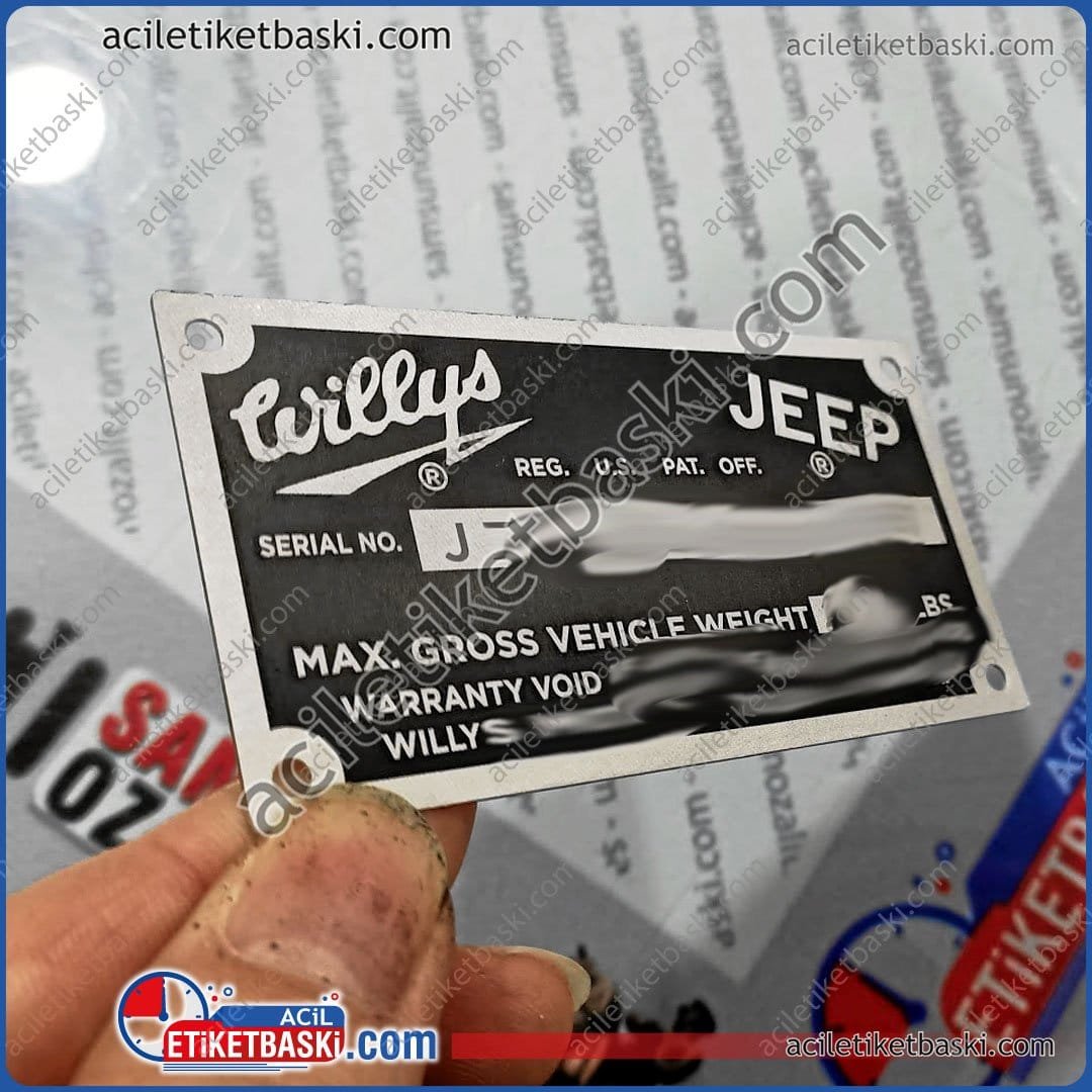 Klasik araç restorasyonlarınız için orijinaline birebir uygun şasi etiketleri! Jeep, Willy’s ve eski araç modellerinizin kaybolan veya hasar görmüş etiketlerini, paslanmaz metal üzerine özenle yeniden üretiyoruz. Orijinal fontlar, desenler ve renkler ile tam uyumlu tasarımlar sunuyor, araç tarihinizi ve karakterini korumanıza yardımcı oluyoruz. Profesyonel tasarım ekibimiz, mevcut etiket fotoğraflarınızdan veya teknik çizimlerden hareketle, aslına sadık kalarak yeni etiketlerinizi oluşturuyor. Acil ihtiyaçlarınız için aynı gün kargo seçeneğimizle, restorasyon projelerinizin hız kesmemesini sağlıyoruz.