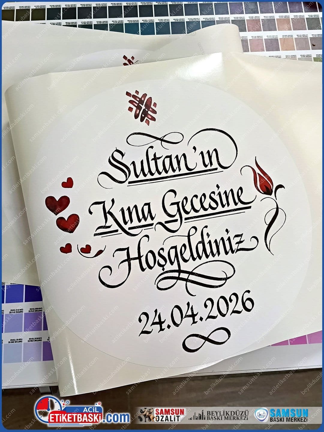 Kına gecelerinizin vazgeçilmezi olan teflerinize zarafet katan hattat el yazısı estetiğiyle tasarlanmış, geleneksel ile moderni birleştiren süslü yazı etiketleri 30 cm çapındaki standart teflere mükemmel uyum sağlayan yüksek kaliteli yapışkanlı folyo malzeme üzerine canlı ve net baskı İsimlerinizin tarihlerinizin veya özel kına mesajlarınızın hattat sanatının estetiğiyle işlendiği, misafirlerinizin dikkatini çekecek göz alıcı görsel tasarım Tef yüzeyine kolayca yapışan, kına gecesi boyunca yerinden oynamayan veya deforme olmayan güçlü yapışkan mukavemetine sahip özel üretim etiket yapısı Samsun’daki baskı merkezimizde kına geceniz için acil ihtiyaçlarınıza yönelik hazırlanan, aynı gün üretime geçilip hızlı kargo ile ulaştırılan profesyonel süsleme çözümü